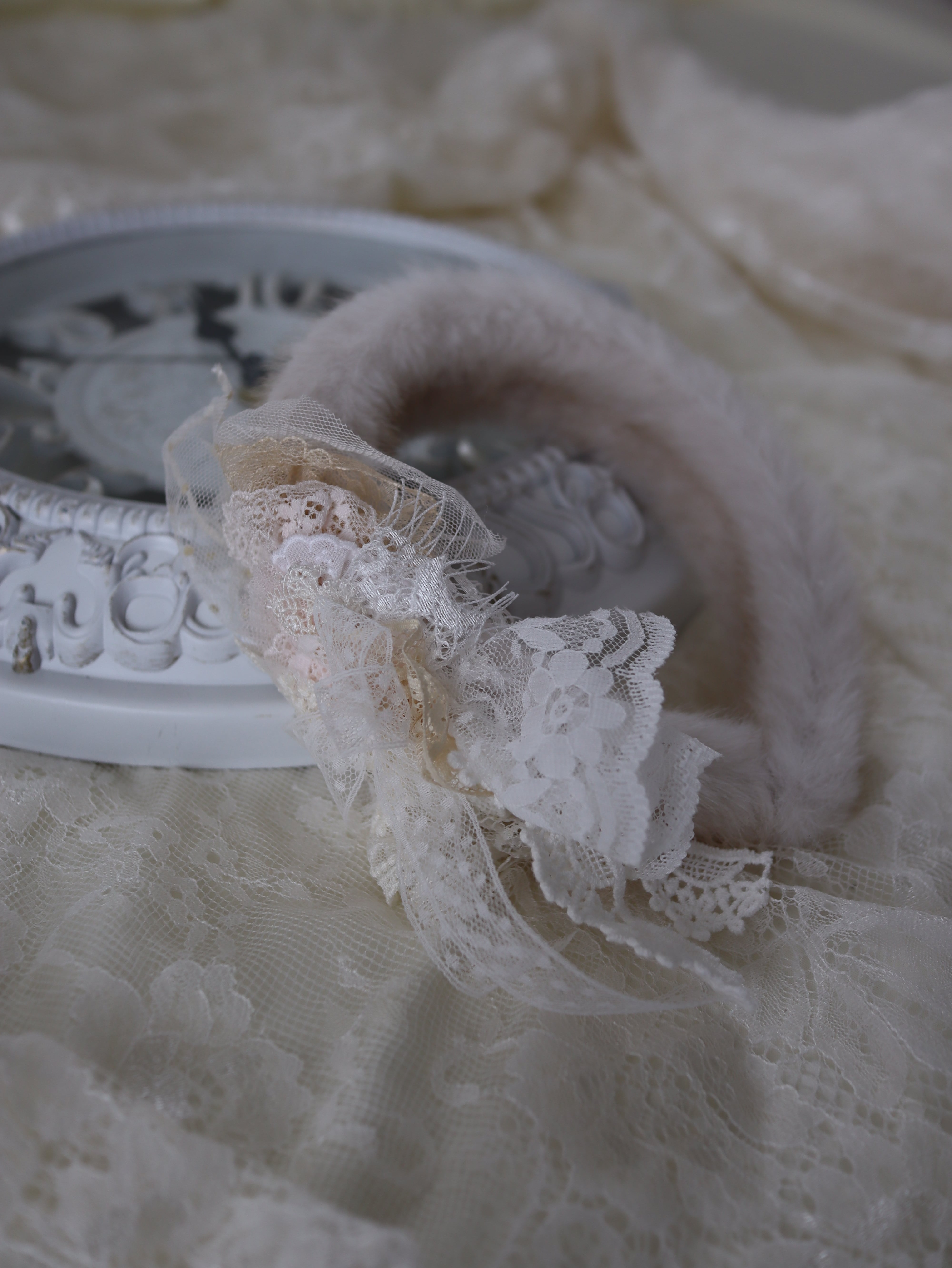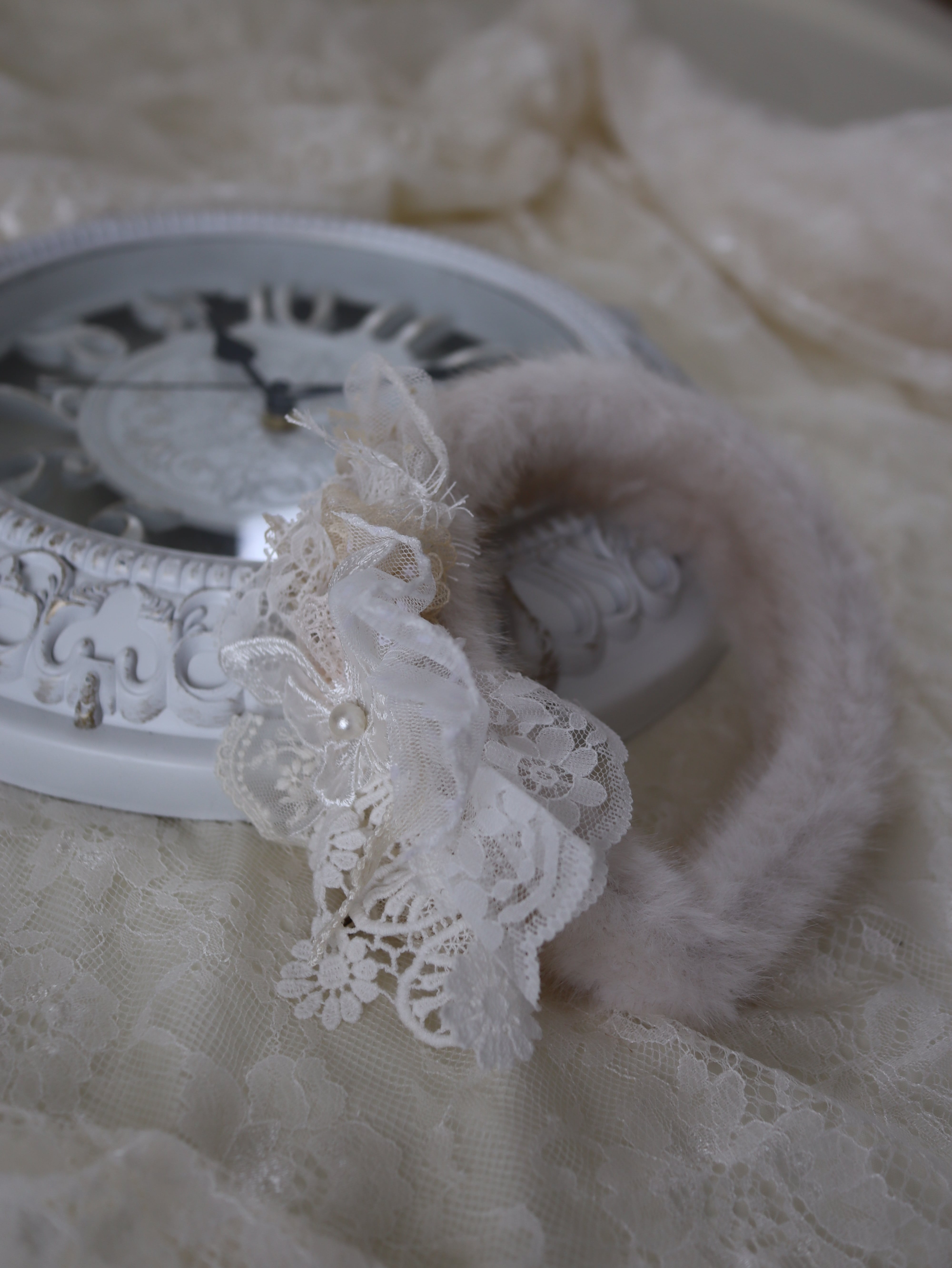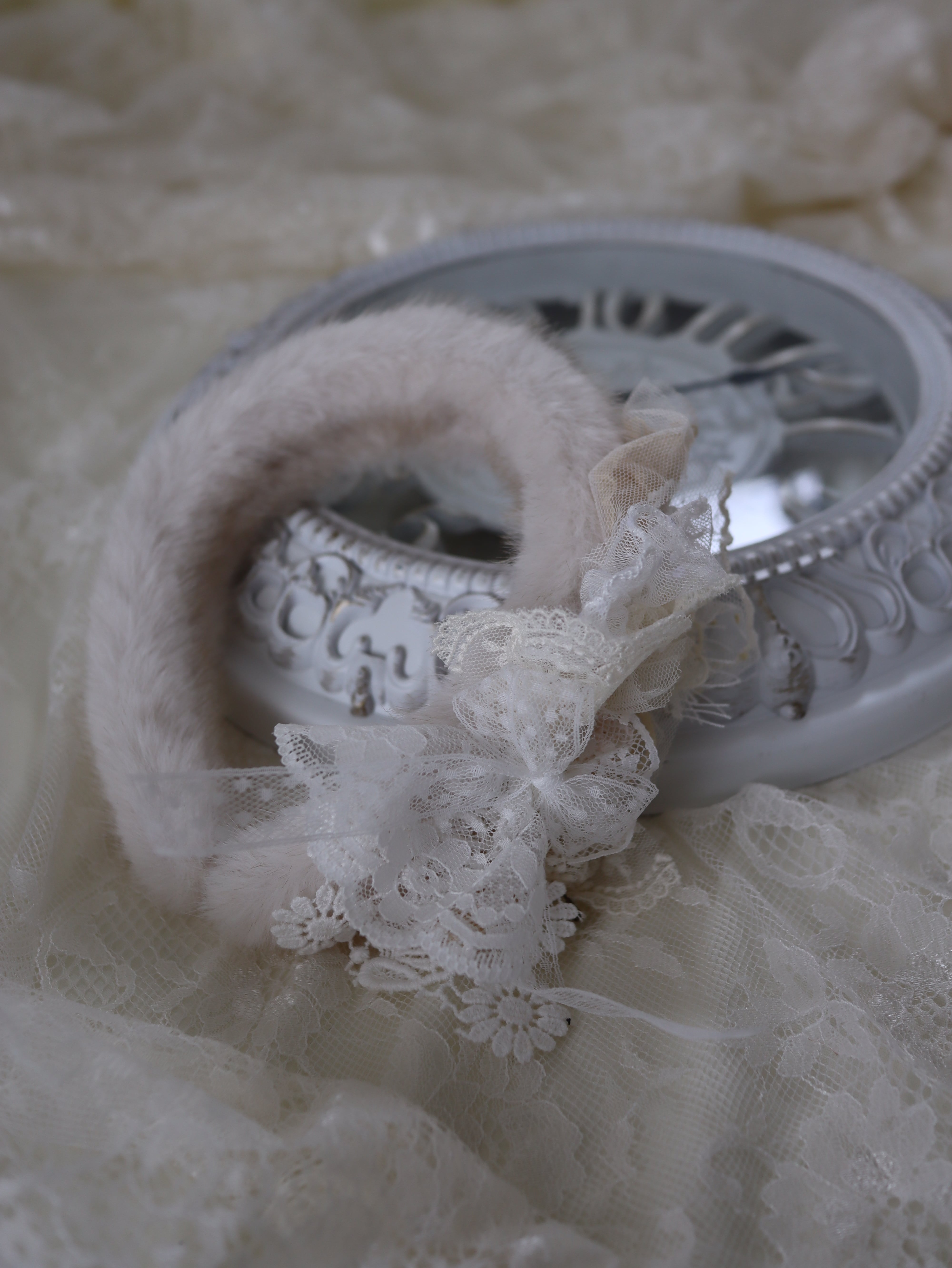 ふわふわのファーに、たっぷり重ねたレースをあしらった特別なカチューシャ。